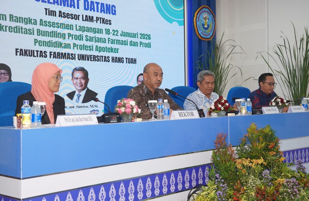 Surabaya – Rektor Universitas Hang Tuah (UHT), Laksamana Muda (Purn) Dr. Ir. Avando Bastari, M.Phil., M.Tr.Opsla., IPM., ASEAN Eng., menegaskan komitmen institusi dalam penguatan mutu pendidikan farmasi saat menutup rangkaian Asesmen Lapangan Akreditasi Bundling Program Studi Sarjana Farmasi dan Program Studi Profesi Apoteker Fakultas Farmasi UHT, Kamis (22/1/2026).